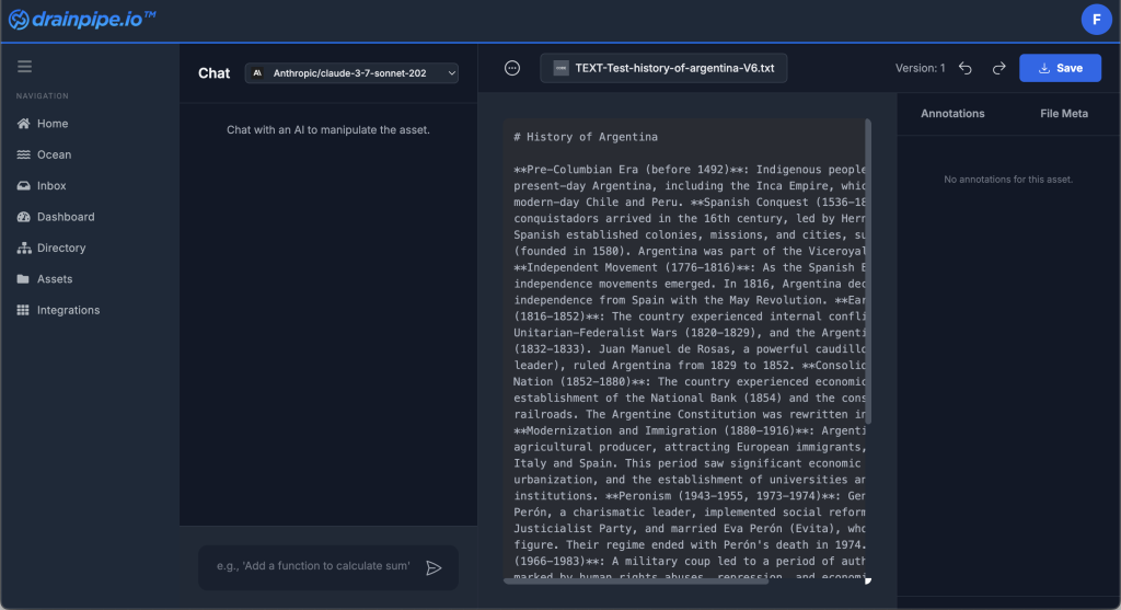 Yes, text based assets can be edited directly in Drainpipe Platform. Navigate to Assets then select the desired text based asset. The asset content can be manipulated directly or the AI Assistant can be used to modify the content using standard prompting techniques.
