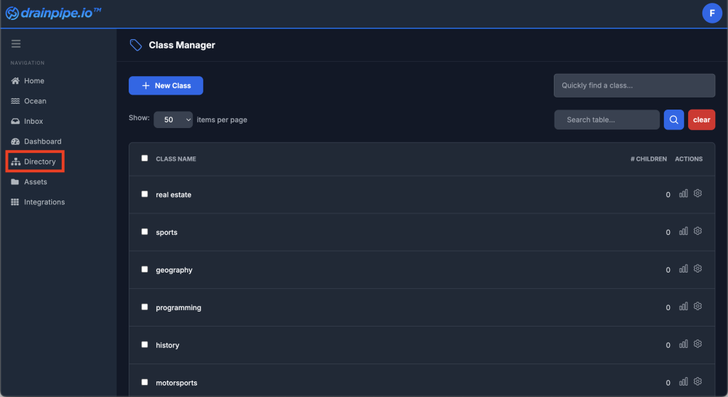 First, Class Categories can be created manually by navigating to “Directory” in the left side menu which will display the Class Directory and Manager. From here the “New” button can be used to create new Class Categories.